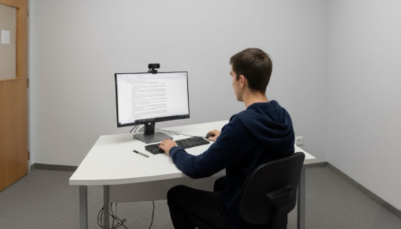Purpose: To take photos from the candidate’s side and rear at an angle of approximately 45 degrees, ensuring a clear view of the candidate’s upper body, computer screen, and hands operating the device throughout the entire process.